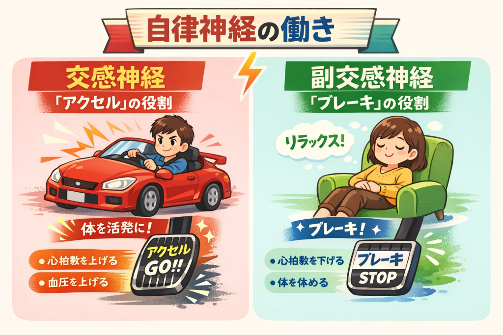 自律神経が乱れるとは、アクセルとブレーキの切り替えがうまくいかなくなっている状態を指します。特に現代では、交感神経ばかりが働き続け、体が休息モードに入りにくくなるケースが非常に多く見られます。