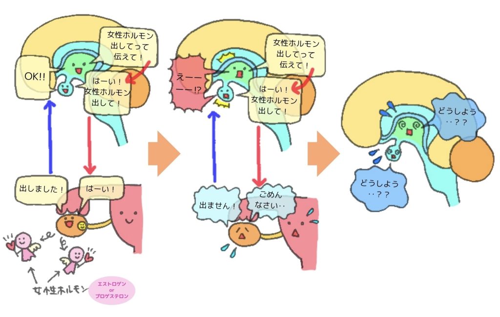ホルモンの調整を担う脳の「視床下部」は分泌量を保とうとして指令を出し続けますが、体がそれに応えられない状態が続くと視床下部に大きな負担がかかります。